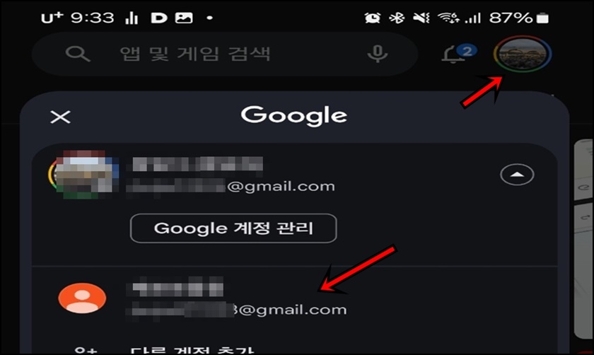 구글스토어/앱스토어를 실행 후 상단 프로필메뉴를 클릭 후 구글 부계정을 클릭하여 계정 전환을 해줍니다.