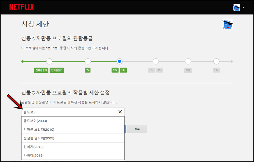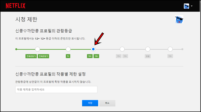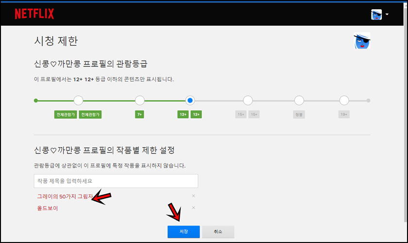 위 사진처럼 특정 작품을 선택하셨다면 "저장"버튼을 클릭하면 해당 작품은 목록에서 제외가 되며, 관람등급을 12세로 하셨다면 그 이상의 등급은 노출되지 않습니다.