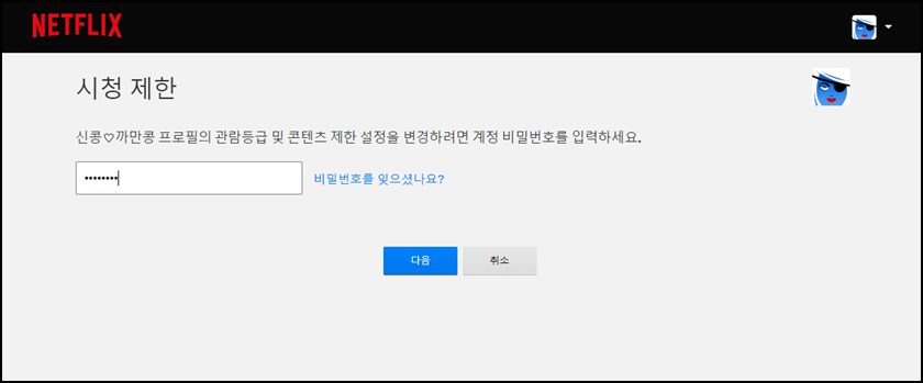시청연령 제한을 설정하기 위해 넷플릭스 로그인 비밀번호를 입력 후 "다음"버튼을 클릭합니다.