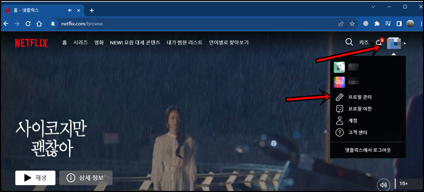 방법은 매우 간단합니다. 스마트폰이나 PC나 설정방법은 큰 차이가 없기에 PC에서 시청 연령제한을 설정하는 방법을 설명드리겠습니다. 먼저 PC에서 넷플릭스 홈페이지 접속 후 로그인을 진행합니다. 로그인을 하시면 오른쪽 상단의 프로필을 클릭 후 "프로필 관리"메뉴로 들어갑니다.