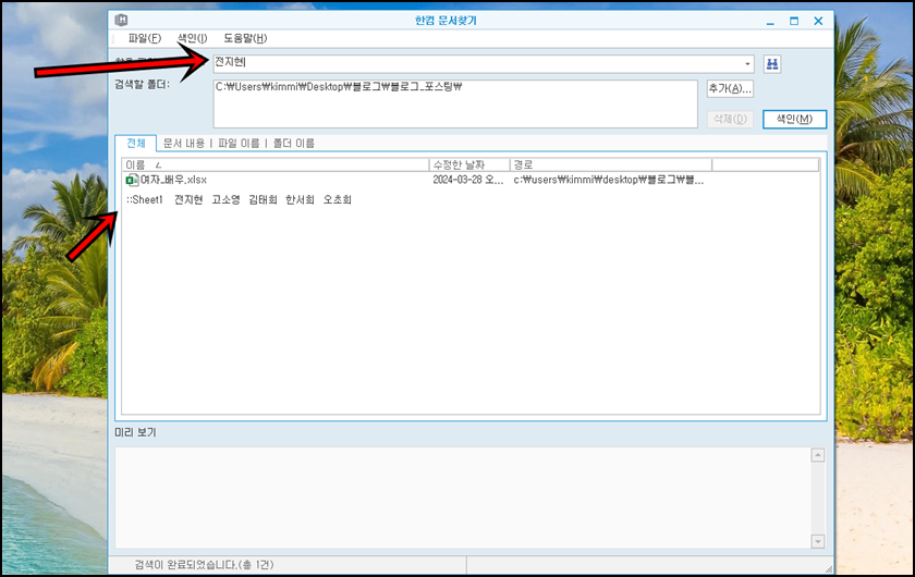 추가로 엑셀파일의 경우도 마찬가지로 특정 키워드만 가지고 검색을 하면 위 사진처럼 파일명과 내용을 찾을 수 있습니다.