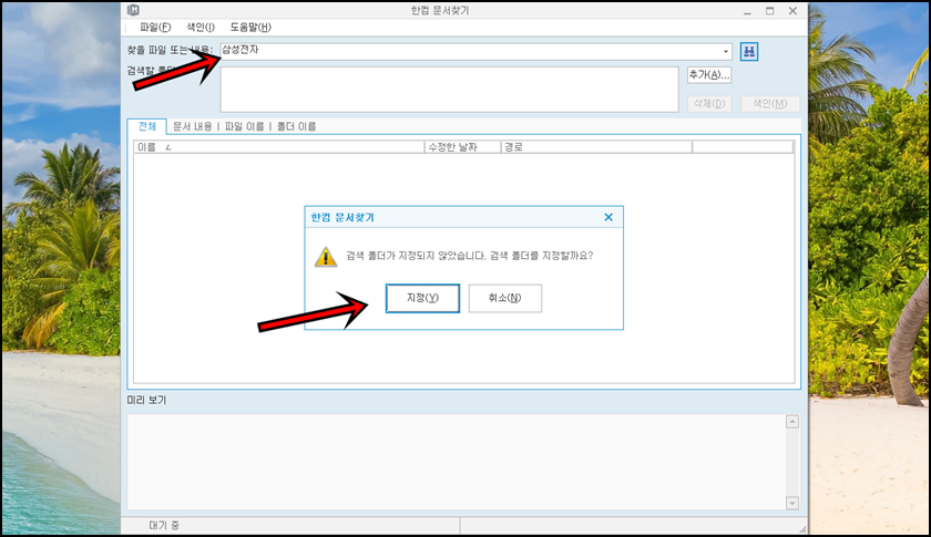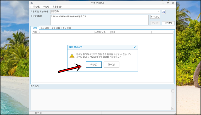 "검색할 폴더가 색인되지 않은 경우 검색을 수행할 수 없습니다. 검색할 폴더 중 색인되지 않은 폴더를 색인할까요?"라는 메시지가 나오면 "색인"버튼을 클릭해 줍니다.