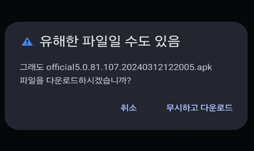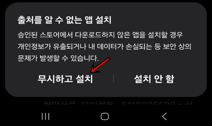 "출처를 알 수 없는 앱 설치"메시지가 나오면 "무시하고 설치"버튼을 클릭합니다.