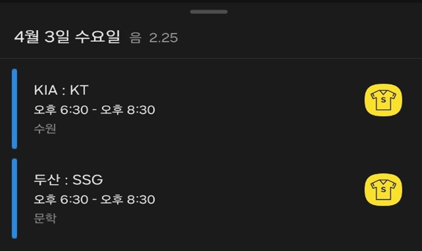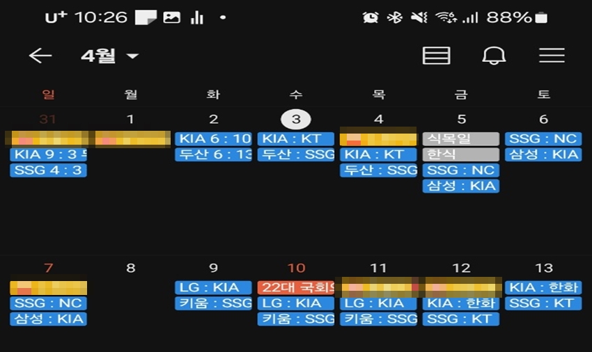 위 사진처럼 제가 좋아하는 프로야구팀의 경기일정을 카카오톡 캘린더를 통해 한눈에 확인할 수 있습니다.