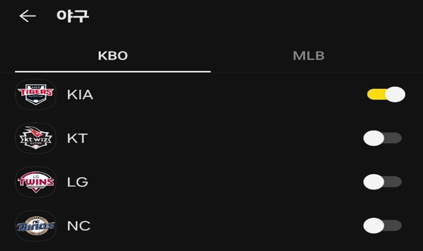만약 원하는 팀의 경기일정을 확인하고 알림을 받고 싶으시다면 해당 팀의 기능을 활성화해줍니다.