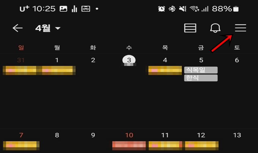위 사진처럼 캘린더를 확인할 수 있는데 오른쪽 상단의 메뉴 버튼을 클릭해 줍니다.