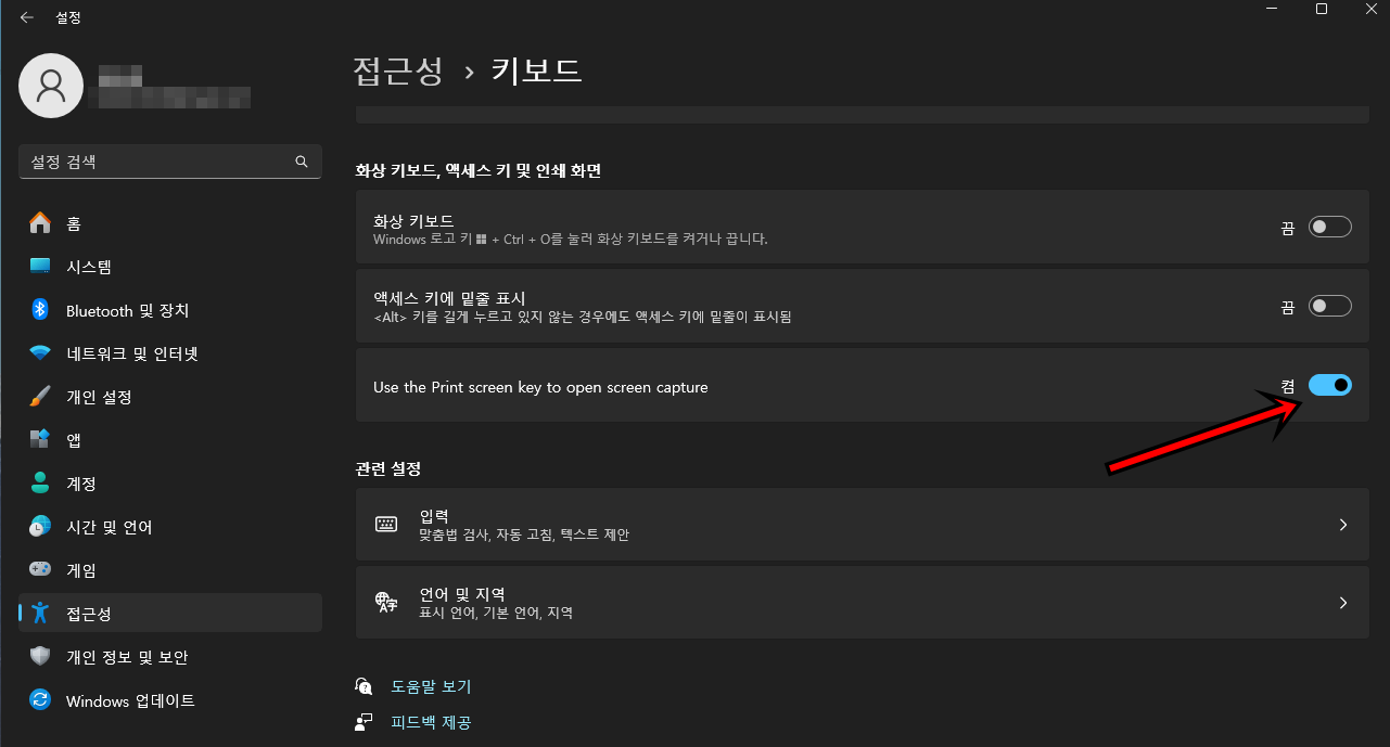 위 사진 속 항목을 보시면 "Use the Print screen key to open screen capture" 항목이 활성화되어 있을 텐데 해당 항목을 비활성해 주시면 Prt Scrn 키로 이제 간단히 전체 캡처가 가능해집니다. 참 쉽죠?
