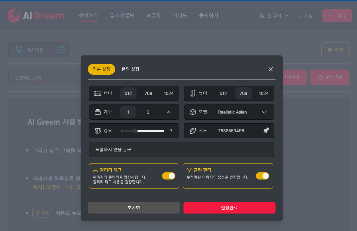 오른쪽 상단의 [설정] 메뉴를 클릭하면 사진의 사이즈, 높이, 모델등을 설정할 수가 있고 부적절한 이미지생성을 방지할 수도 있습니다. 우선 클린필터를 꺼보고 AI가 만들어주는 그림을 생성해 보도록 하겠습니다.