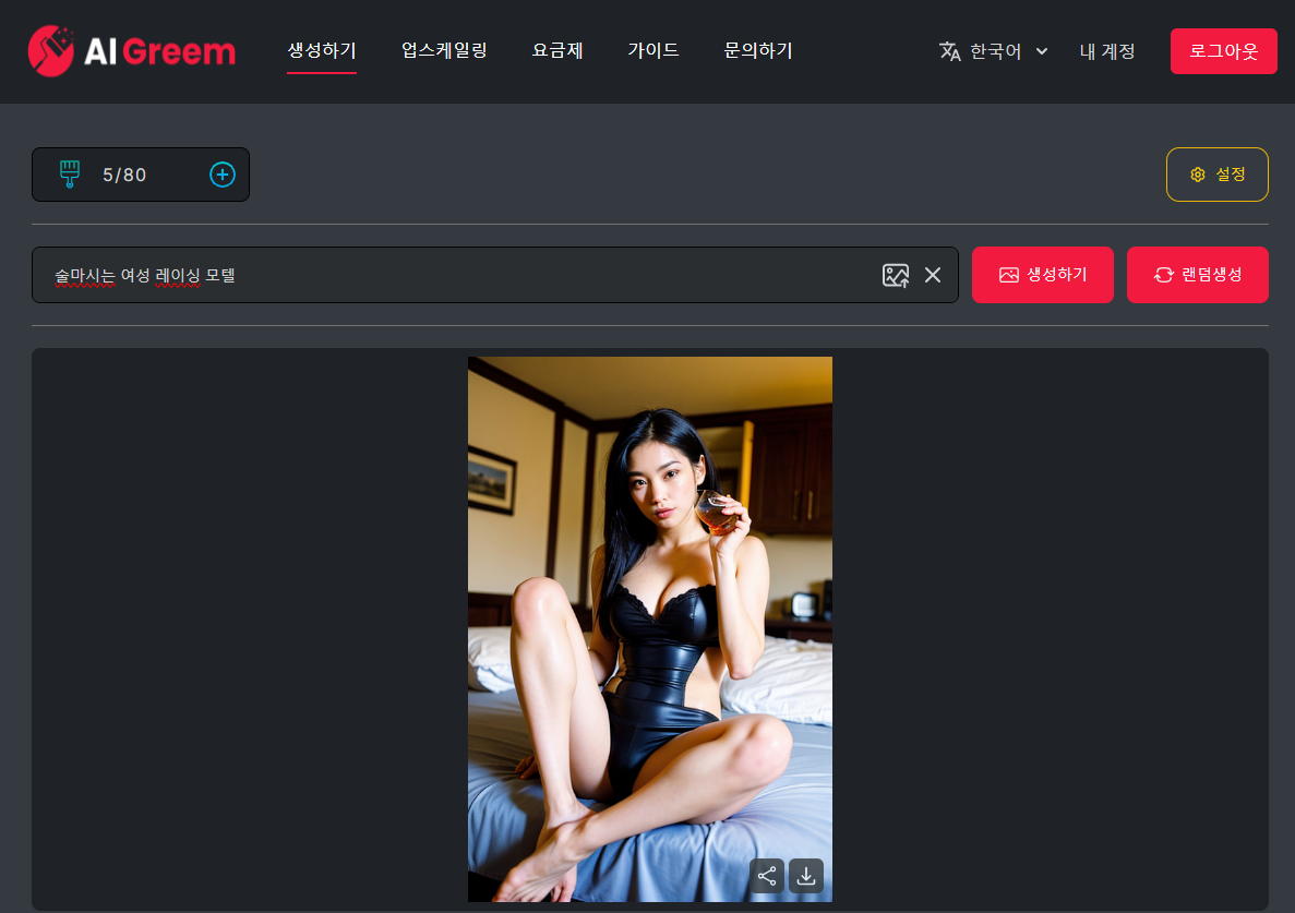 위 사진처럼 해당 검색창 같은 곳에 여러분이 원하는 자사 헨 그림의 키워드를 입력 후 생성하기 버튼만 클릭하면 AI가 5초 만에 그림을 그려줍니다. 저는 우선 "술 마시는 레이싱 모델"이라는 키워드를 입력 후 생성하기를 클릭해 봤습니다.