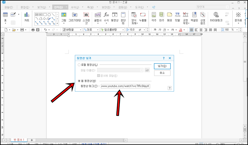 다시 한글로 돌아와서 동영상 넣기에서 이번엔 "웹 동영상"을 체크 후 동영상 태그 부분에 복사했던 링크주소를 넣어주고 [넣기]를 클릭합니다.