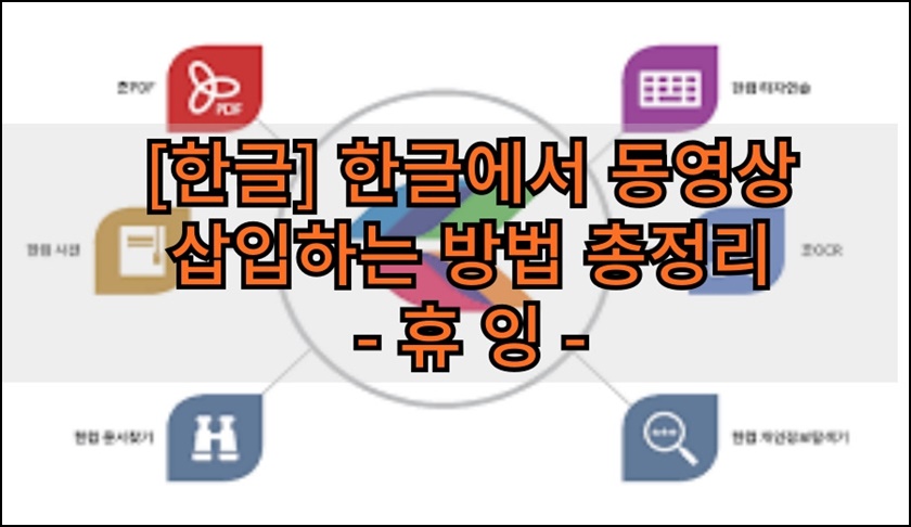 안녕하세요 오늘도 휴잉의 블로그를 찾아주신 여러분 감사드립니다. 오늘 제가 포스팅할 내용은 한글에서 동영상을 삽입하는 방법에 대해 포스팅해보려고 합니다. PPT나 혹은 엑셀의 경우 동영상을 삽입하여 문서를 만드는 경우가 많습니다. 상대적으로 한글의 경우에는 대부분 텍스트위주의 문서를 만들기에 동영상을 삽입하는 경우는 많지 않습니다. 그러나 혹시 한글에서 동영상 삽입하는 방법에 대해 궁금하신 분들이 계실 수도 있을 것 같아 간단하게 한글에서 동영상을 삽입하는 방법을 설명드리겠습니다.