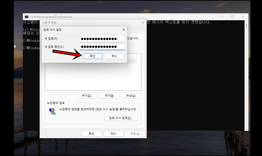 새로 사용될 윈도 암호를 입력후 "확인"버튼을 클릭합니다.
