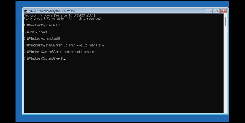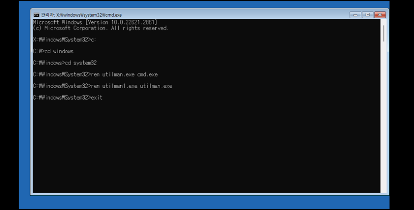 새로 입력한 윈도우 비번을 입력하면 정상적으로 로그인되는 걸 확인할 수 있을 겁니다. 여기까지 작업 후 사용하셔도 무방하나 앞서 utilman.exe을 원복 하기 위해 한 가지 더 작업을 해주시면 좋습니다.