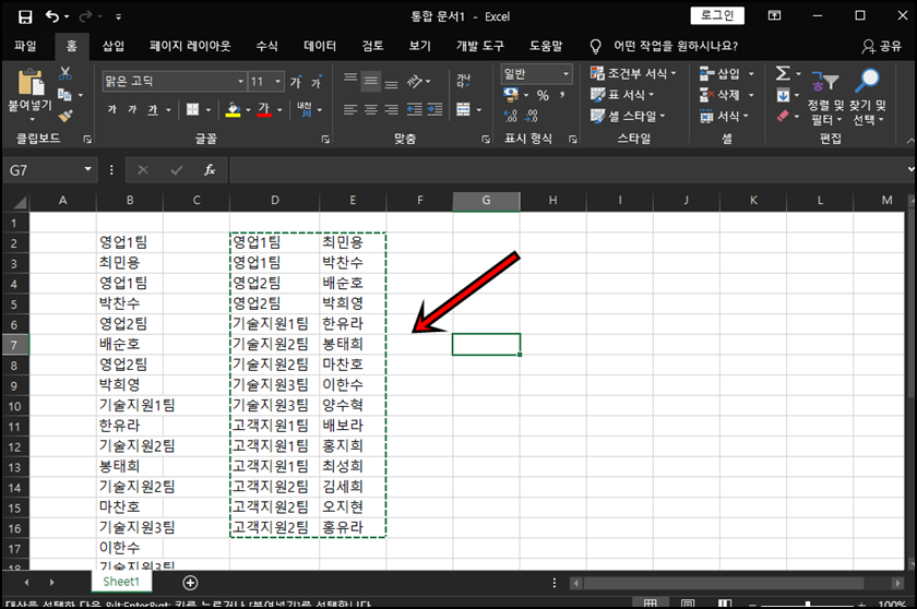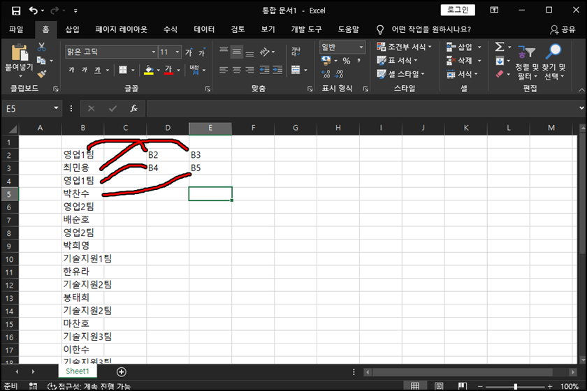 먼저 영업1팀 셀 번호인 B2를 D2에, 이름 셀번호인 B3을 E2에 입력해 줍니다. 마찬가지로 B4, B5까지 입력해 줍니다.