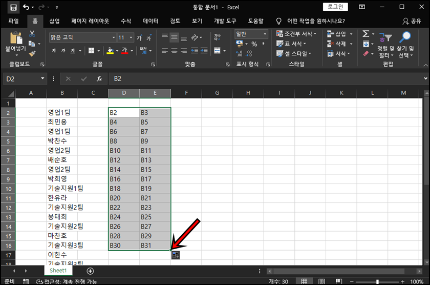 채우기 핸들을 통해 셀번호가 B31까지 있기에 나머지를 채워줍니다.