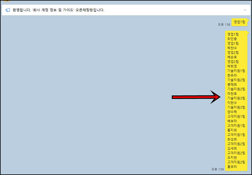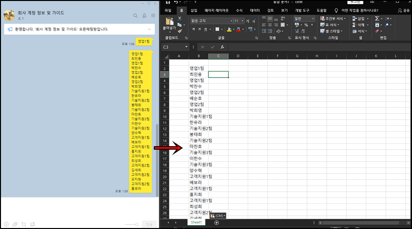 위 사진과 같이 카톡으로 직원명단이나 데이터를 보내왔다고 가정해 보겠습니다. 이 데이터를 엑셀로 복사 붙여 넣기 해보겠습니다.