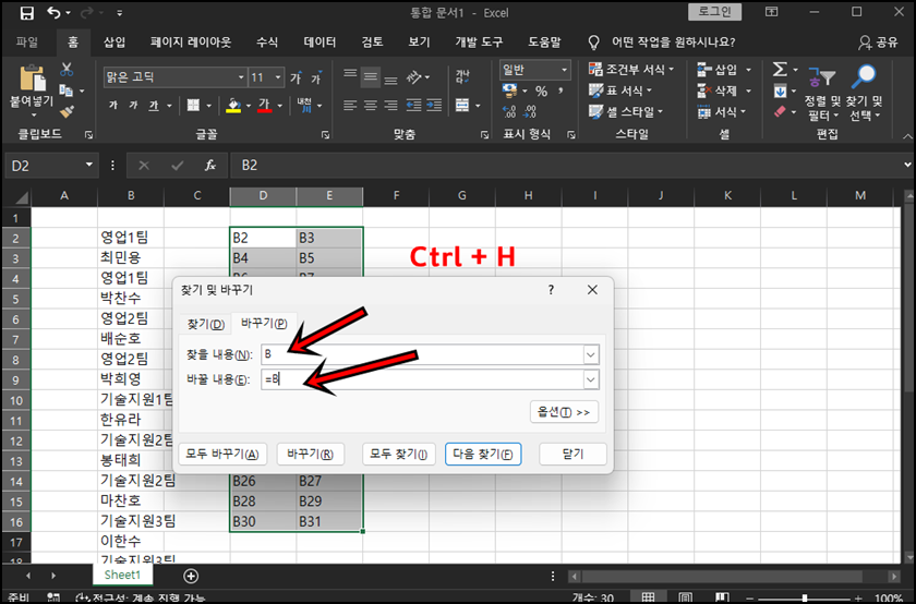 이제 Ctrl + H(찾기 및 바꾸기)를 클릭 후 찾을 내용에는 B, 바꿀 내용에는 =B를 입력 후 "모두 바꾸기"를 클릭합니다.