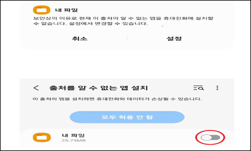 혹시나 만약 앱스토어가 아닌 외부 링크를 통해 apk설치파일을 설치하려고 하면 위 사진처럼 보안상의 이유로 설치가 되지 않으며 권한이 활성화되지 않습니다. 어떤가요 지금 당장 부모님 스마트폰에 설정하고 싶으시죠?^^