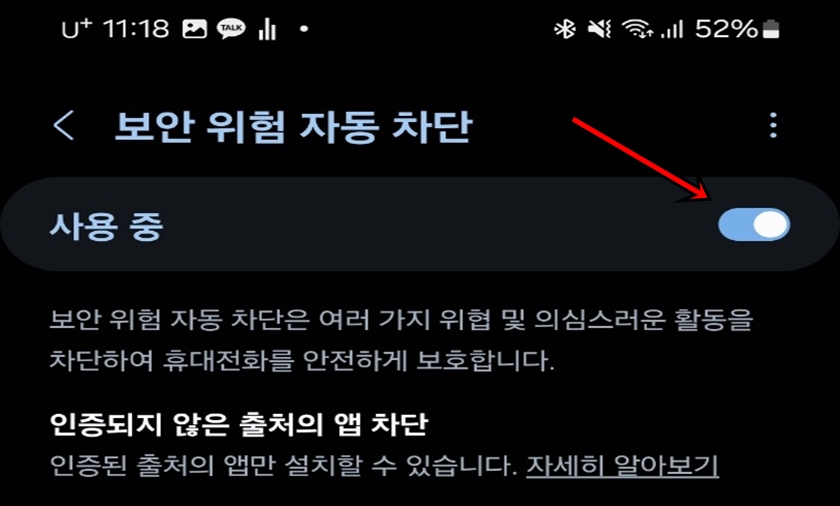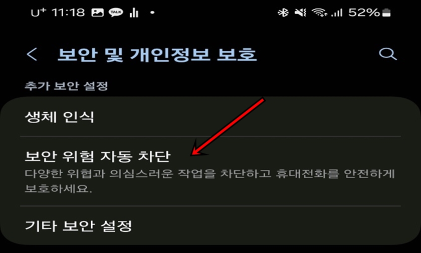 "보안 위험 자동 차단"을 클릭해 줍니다. 해당 기능은 다양한 위협과 의심스러운 작업을 차단하고 휴대전화를 안전하게 보호할 수 있는 기능입니다.