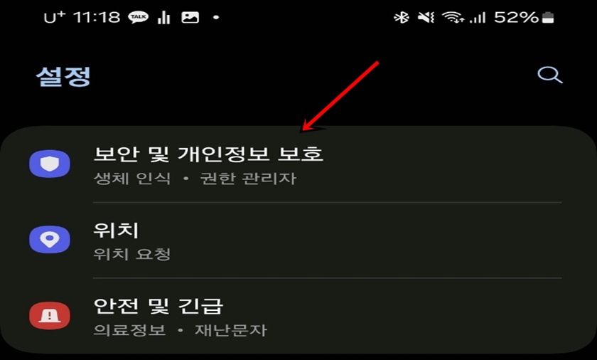 설정 항목 중에서 "보안 및 개인정보보 보호" 메뉴로 들어가 줍니다.