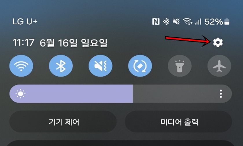 먼저 상단 탭을 내려서 위 사진처럼 톱니바퀴[설정]메뉴를 클릭해 줍니다.