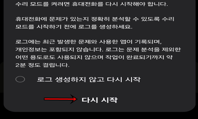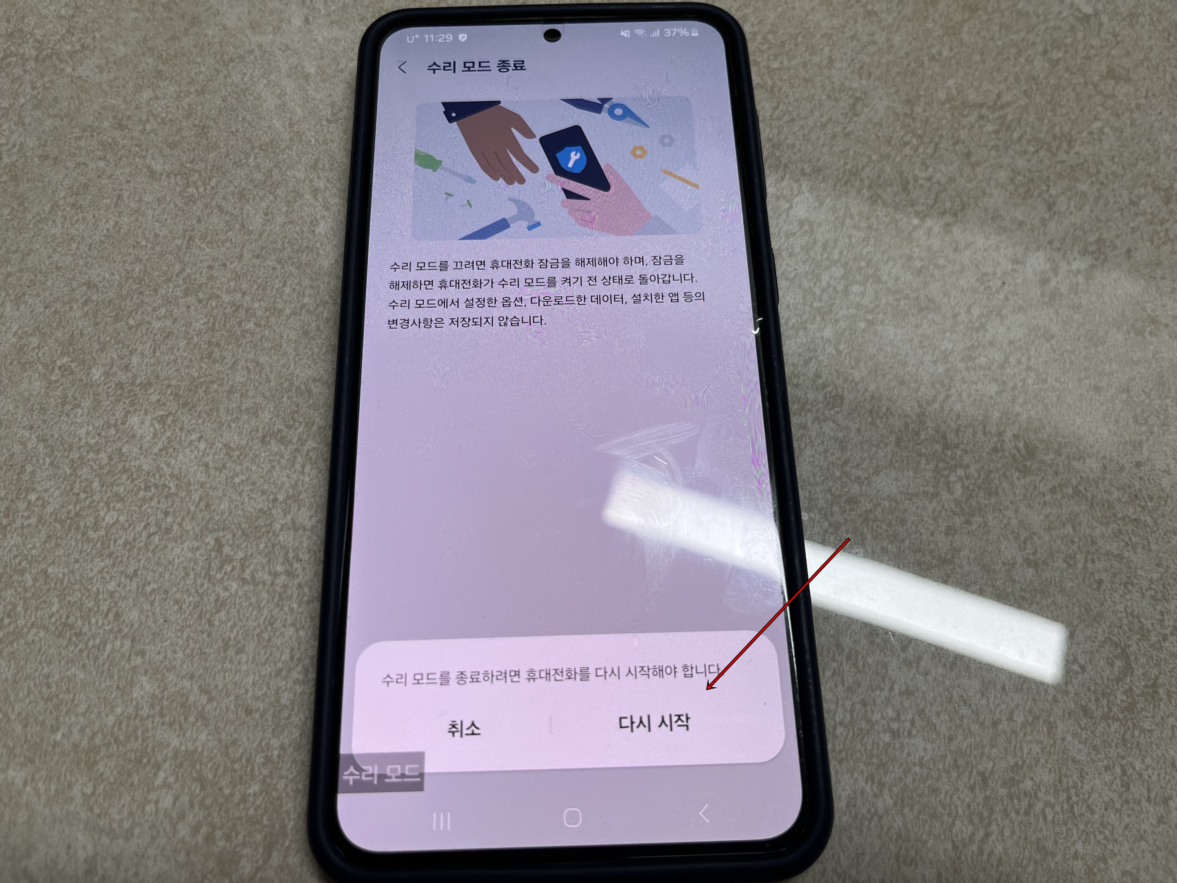 수리모드를 하려면 스마트폰을 다시 시작해야 합니다. "다시 시작"을 클릭해 줍니다.