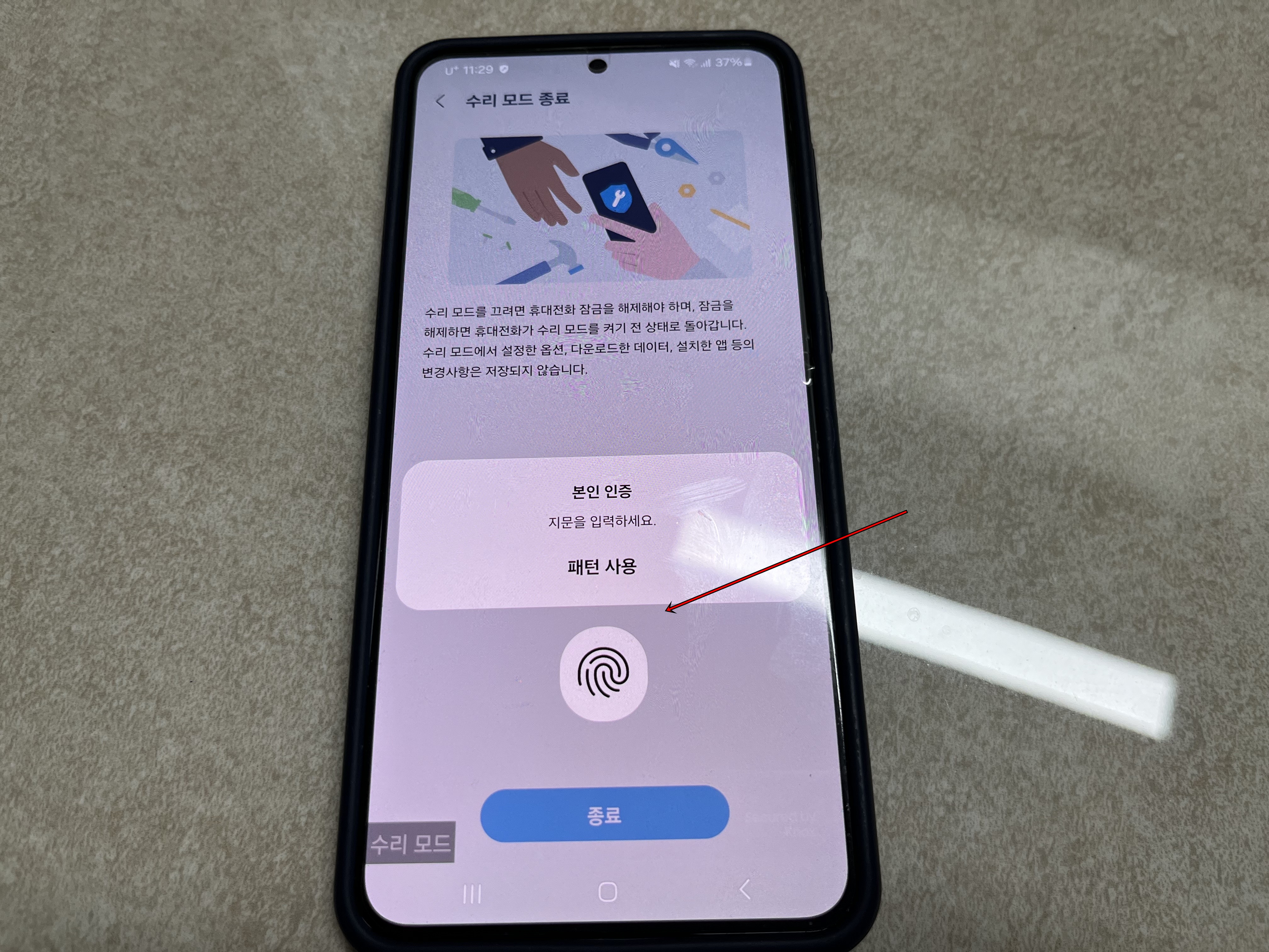 수리모드를 종료하기 위해선 여러분이 등록했던 지문이나, 패턴 등을 이용해 해지가 가능합니다. 이 수리모드 기능을 통해 스마트폰에 문제가 있을 경우 수리모드 설정 후 수리를 맡기시면 될 것 같습니다. 하지만 간혹 어떤 문제로 인해 수리모드에서는 불가능하다며 패턴이나 비번을 요구하는 경우도 있다고 합니다. 그럴 때는 어떻게 할까요? 아랫부분을 확인해 주세요.