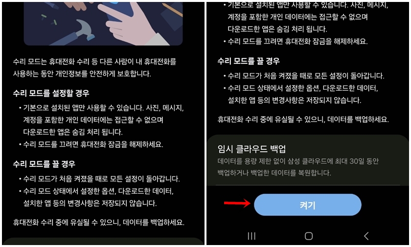 수리모드를 설정할 경우 기본으로 설치된 앱만 사용이 가능한데, 사진, 메시지, 계정을 포함한 개인 데이터에는 접근할 수 없다고 합니다. 도한 다운로드한 앱은 숨김처리가 됩니다. 자 수리모드를 켜기 위해 "켜기"버튼을 클릭해 줍니다.