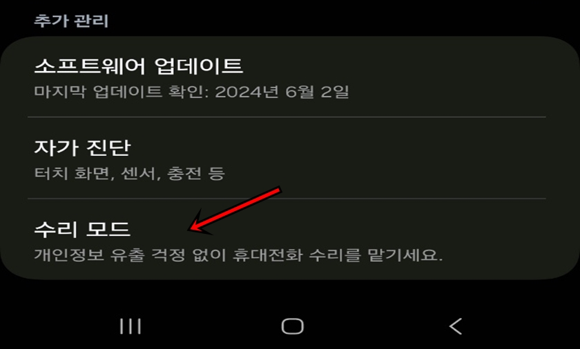 페이지 맨 하단으로 내려보시면 "수리 모드"라고 보이실 텐데, 개인정보 유출 걱정 없이 휴대전화 수리를 맡길 수 있는 기능이라고 합니다. 클릭해 줍니다.