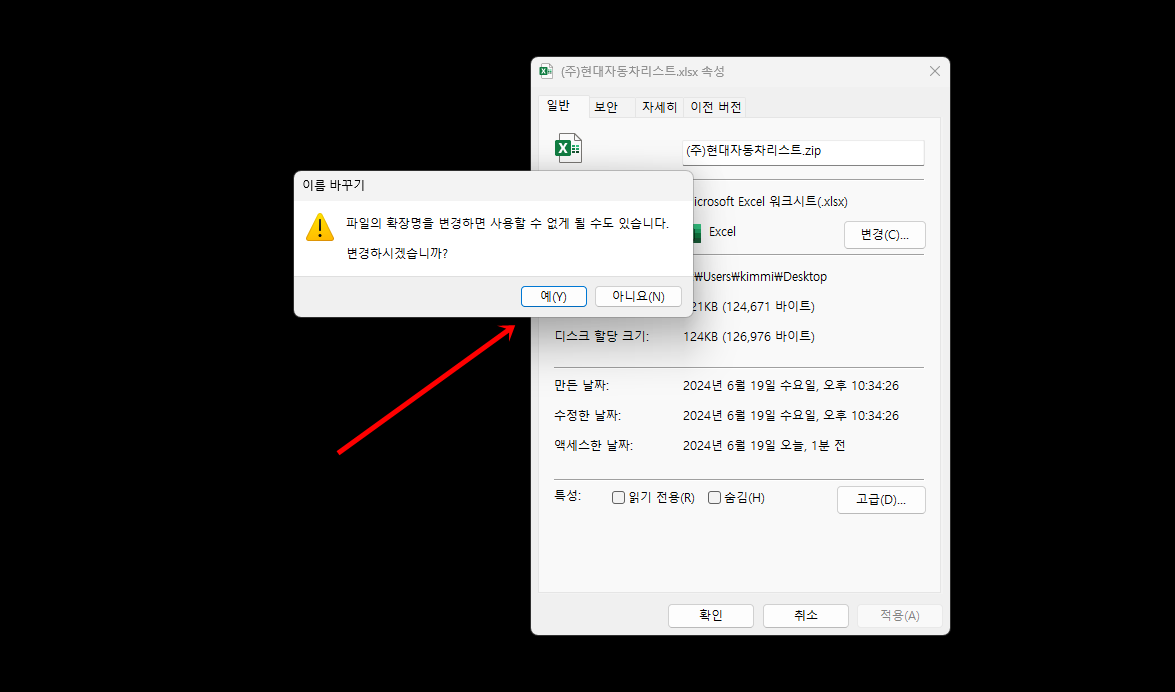 "파일의 확장명을 변경하면 사용할 수 없게 될 수도 있습니다" 라는 메시지가 나오면 그냥 "확인"을 클릭해 줍니다.