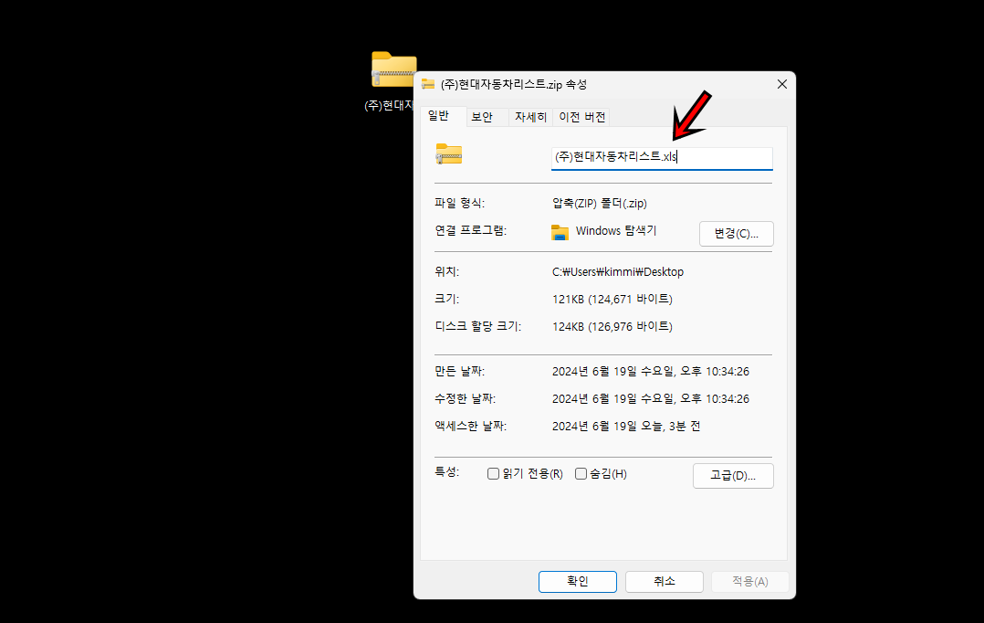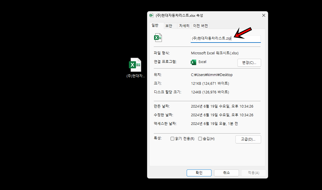 먼저 엑셀파일의 마우스 우클릭 -> 속성 or F2키를 눌러서 파일의 확장자를 xls에서 zip으로 변경을 해줍니다.
