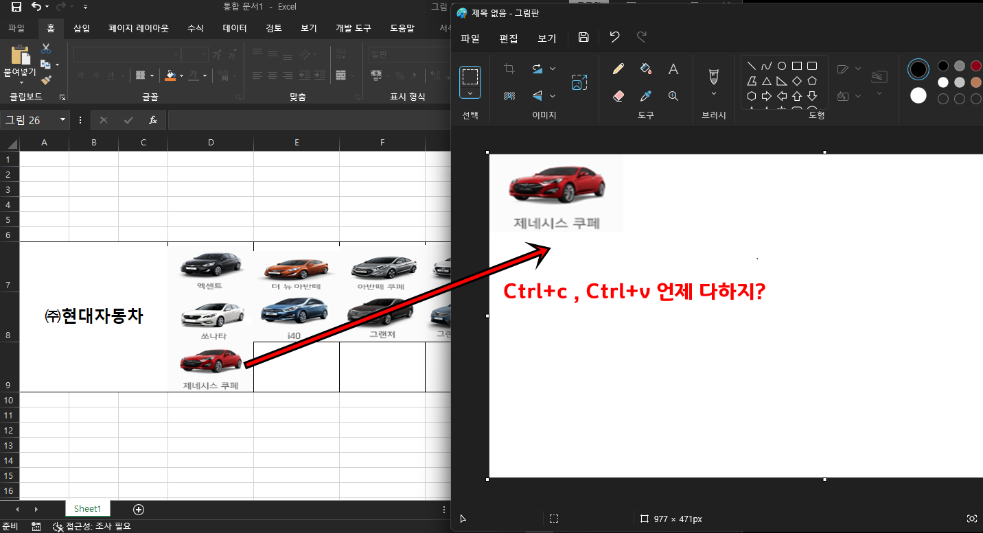 만약 엑셀에 위와 같이 사진파일들이 가득있다고 가정해 보겠습니다. 어떠한 이유로 사진파일들을 하나씩 저장해야 하는데, 위와 같이 그림판에 Ctrl + C, Ctrl + V를 통해 그림판을 저장하는 방법으로는 작업소요시간이 너무 오래 걸릴 수 있습니다. 이와 같은 경우 한 번에 저장하는 방법입니다.