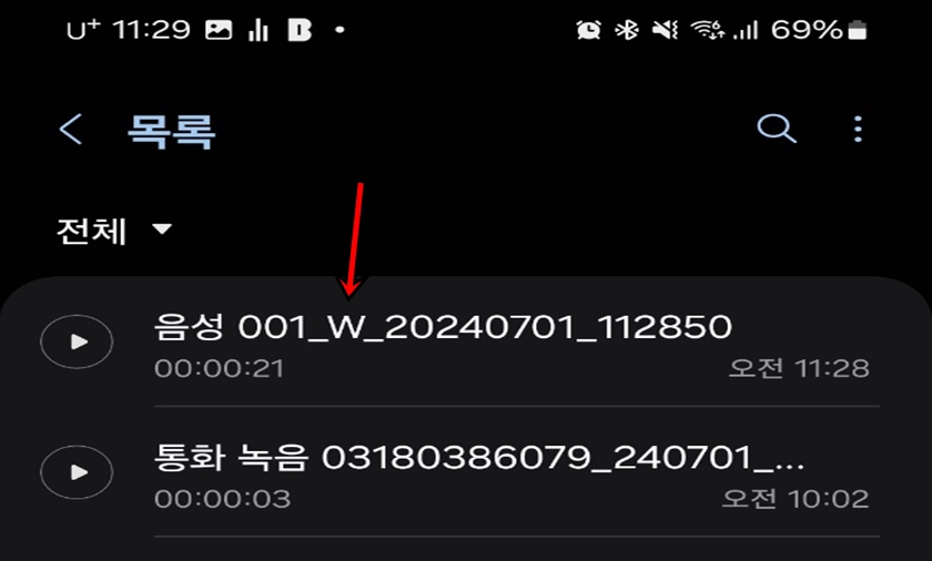 음성녹음파일 중 워치에서 녹음된 파일과 스마트폰자체에서 녹음된 파일의 이름이 다르게 표시가 됩니다. 위 사진처럼 날짜 앞에 W로 표시된 파일이 워치에서 녹음된 음성녹음 파일입니다.