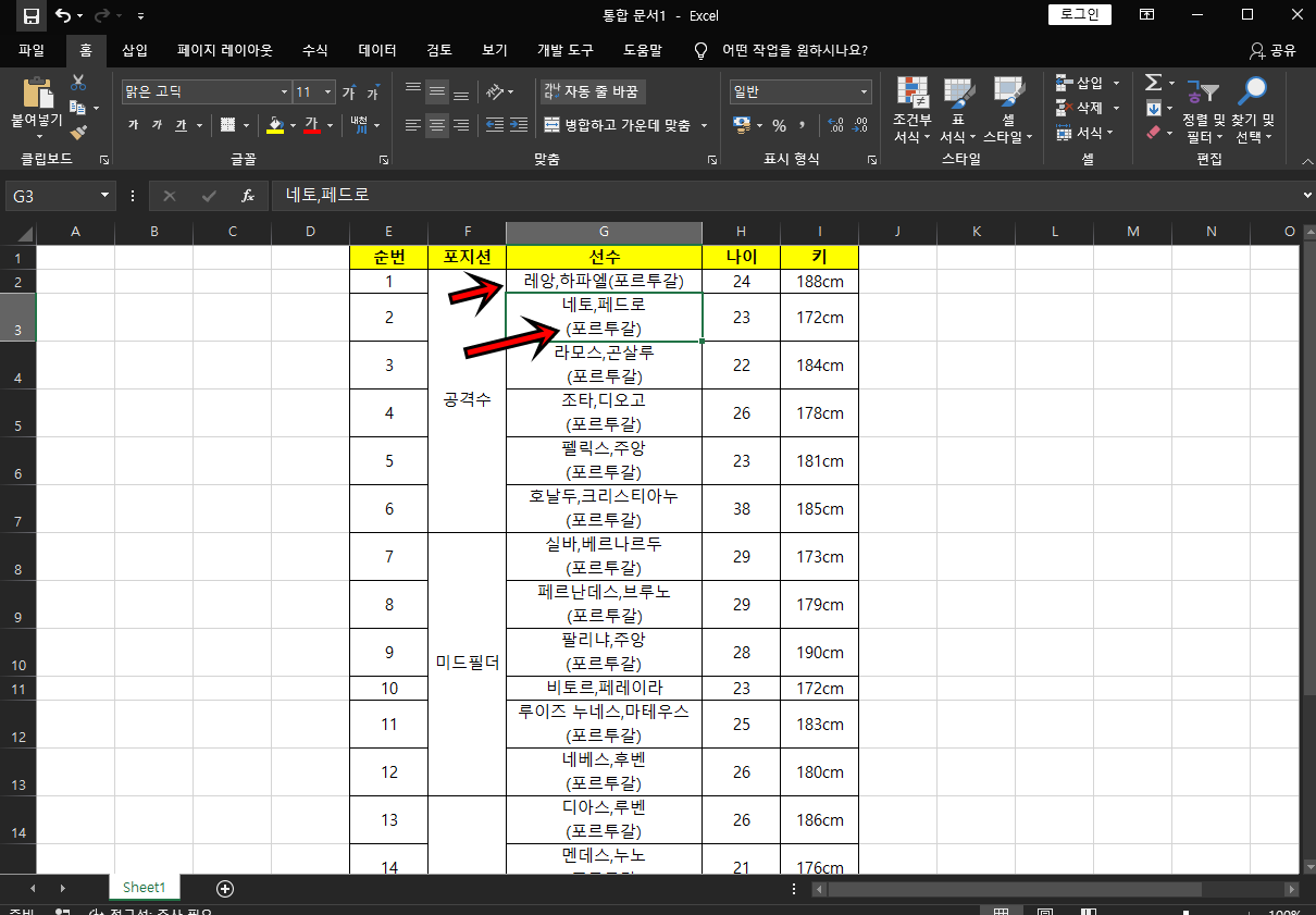 예를 들어 위 와 같은 엑셀 데이터가 있다고 가정해 보겠습니다. G3셀을 보면 이름과 국가가 한셀에 위아래로 나뉘어있는데, G2셀처럼 한 줄로 만들어야 하는 경우가 있습니다. 일일이 하나씩 셀을 선택해서 맞춰야 하는 번거로움이 있습니다. 이때 한 번에 수정할 수 있는 함수가 바로 CLEAN함수입니다.