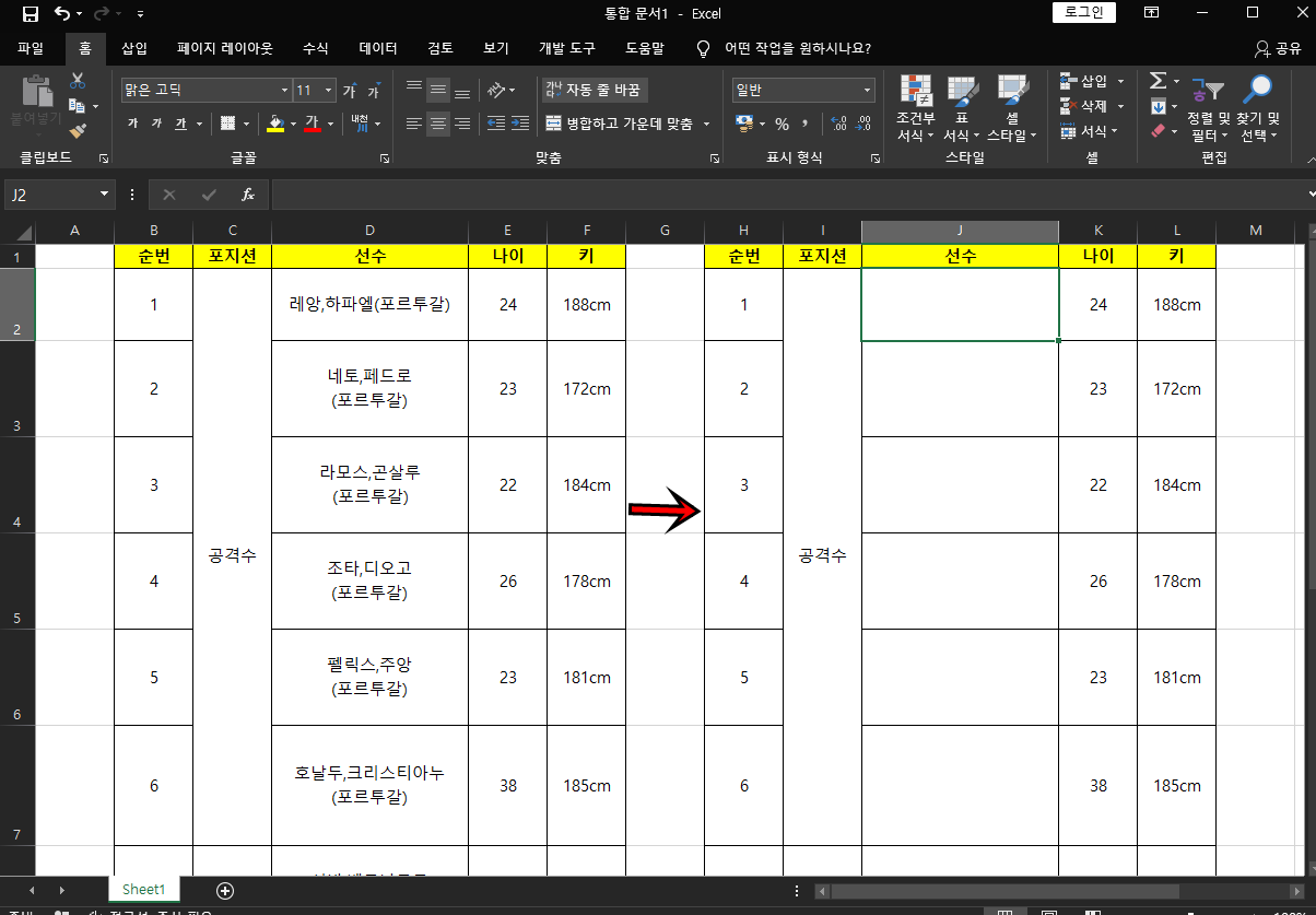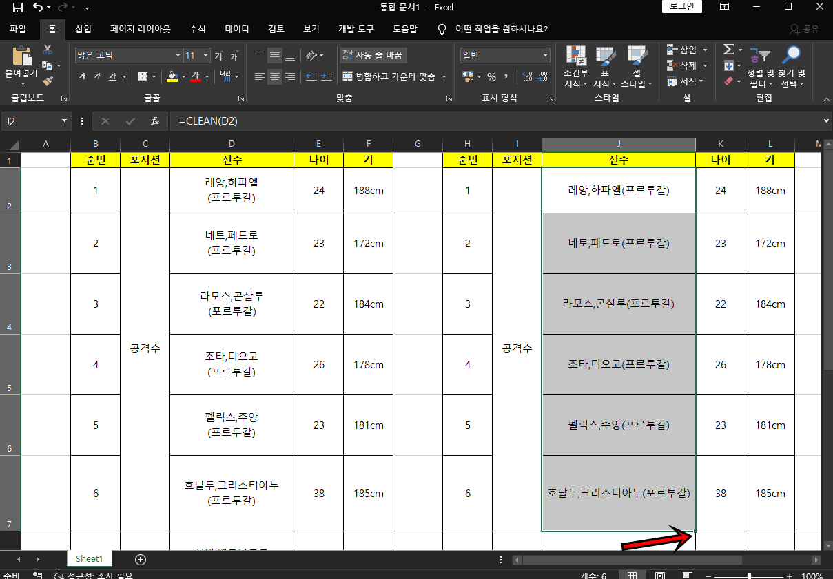 위 사진과 같이 D2셀이 J2셀 처럼 적용되게 됩니다.