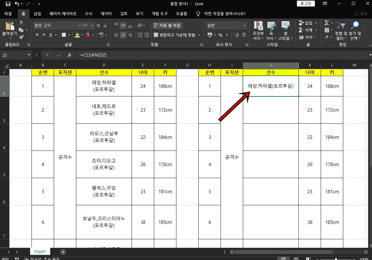 그다음 적용할 셀에 =CLEAN(원본표의 셀 위의 예제에서는 D2)를 입력 후 Enter를 쳐줍니다.