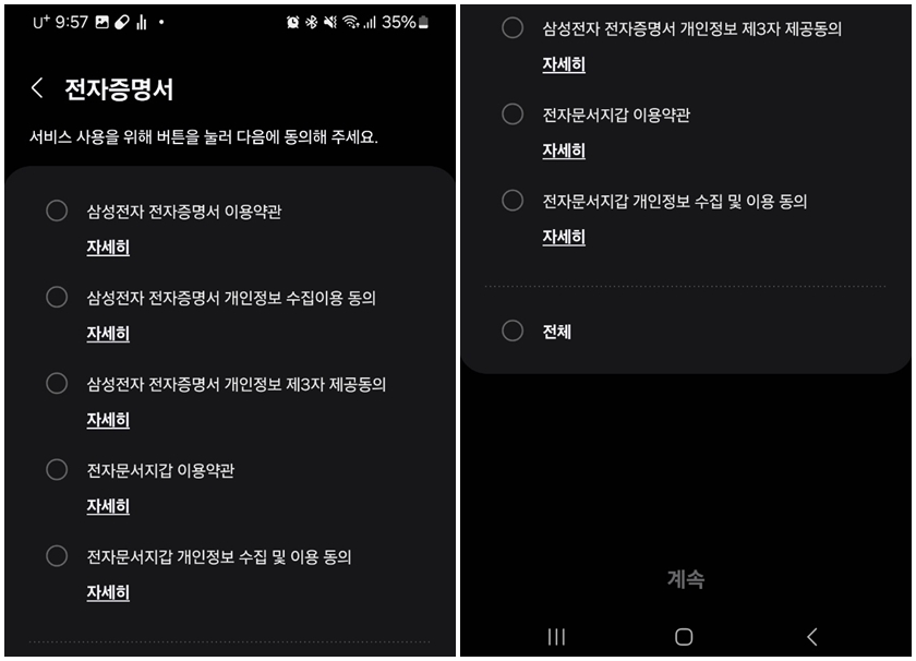 처음 사용하기에 "전자증명서"이용에 대한 약관등을 동의해야 합니다. "전체"를 클릭 후 "계속"진행해 줍니다.
