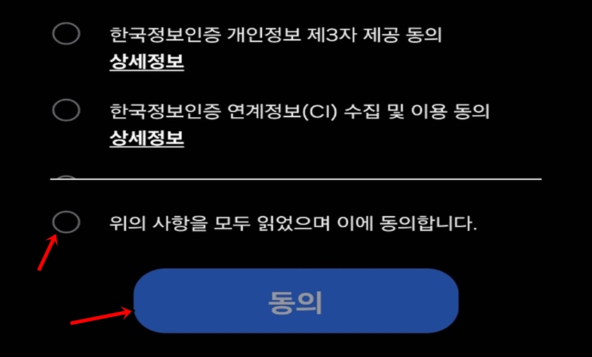 "위의 사항을 모두 읽었으며 이에 동의합니다."를 클릭 후 "동의"를 선택해 줍니다.