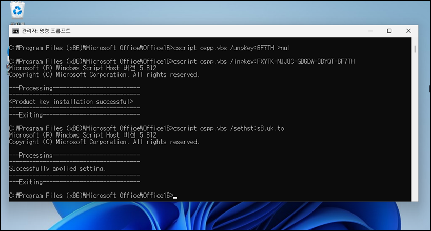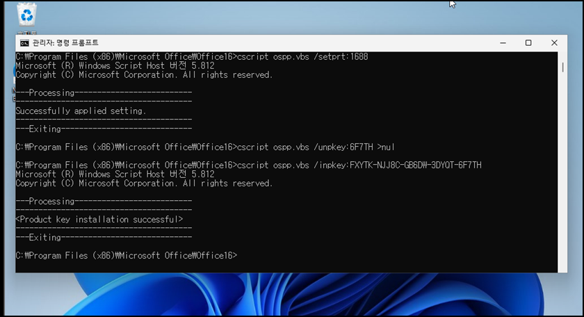 오피스 설치된 버전 및 위치에 따라 명령어가 다릅니다. 32비트 혹은 64비트 명령어를 입력해 줍니다. 만약 32비트 명령어를 했는데 파일이 없다거나 경로가 없다고 하면 64비트 명령어를 입력해 주시면 됩니다.
