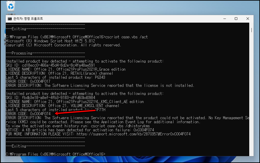 마지막으로 위 명령어를 복사해서 붙여넣기 해줍니다. 그런데 위 사진과 같아 "ERROR CODE: 0x0004 F074" 에러가 나는 걸 확인할 수 있습니다. 에러가 나지 않는다면 이 상태로 오피스 2021을 실행해 보시면 정품인증이 완료되었다고 나오겠지만 에러가 나오면 정품인증이 되지 않았을 겁니다. 에러가 나오신 분들은 아랫부분을 확인해 주세요.