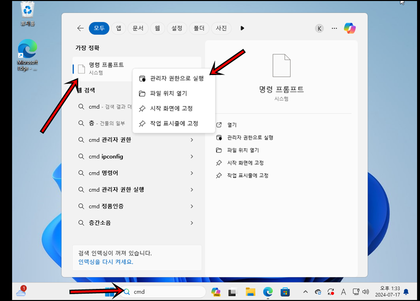 먼저 컴퓨터에서 검색창에 "cmd"를 검색 후 명령프롬프트에 마우스 오른쪽 클릭 후 "관리자 권한으로 실행"을 해줍니다.