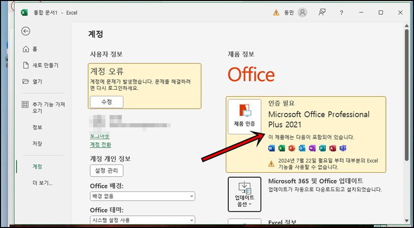 설치가 완료가 되고 excel이나 ppt를 실행해 보시면 위 사진처럼 "Microsoft Office Professional Plus 2021"이 정품인증이 필요하다는 문구를 확인할 수 있습니다. 정품인증을 하지 않으면 7일 간만 사용이 가능한데, 유료 라이선스 구입필요 없이 간단하게 이제부터 정품인증을 하는 방법을 설명드리겠습니다.