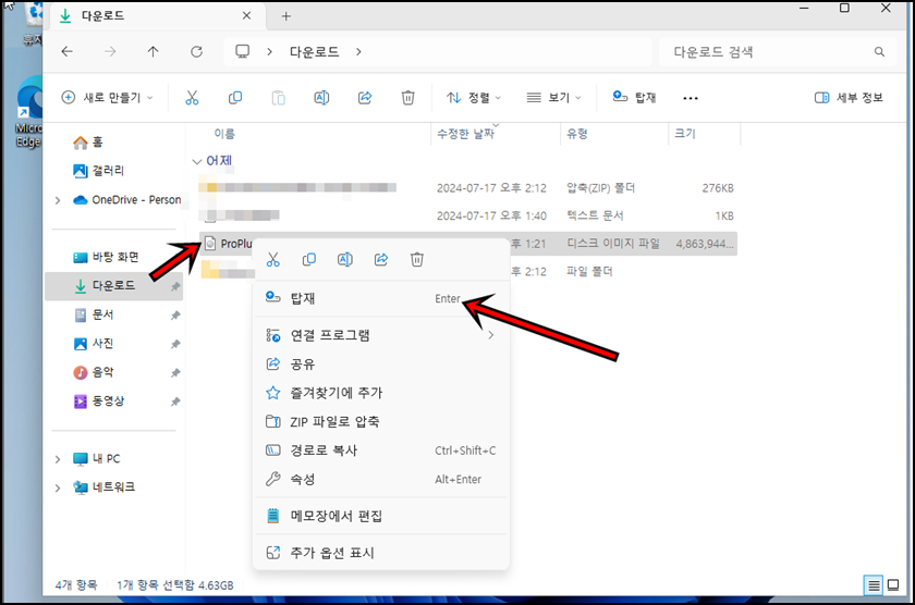 다운로드된 파일에 마우스 오른쪽 클릭 후 "탑재"버튼을 클릭해 줍니다. 그러면 내 PC에 보시면 DVD드라이브에 디스크 이미지가 탑재가 될겁니다. 팝업창이 뜨면 확인버튼을 눌러 넘어가셔도 되고 직접 내PC -> DVD드라이브로 이동하셔도 됩니다.