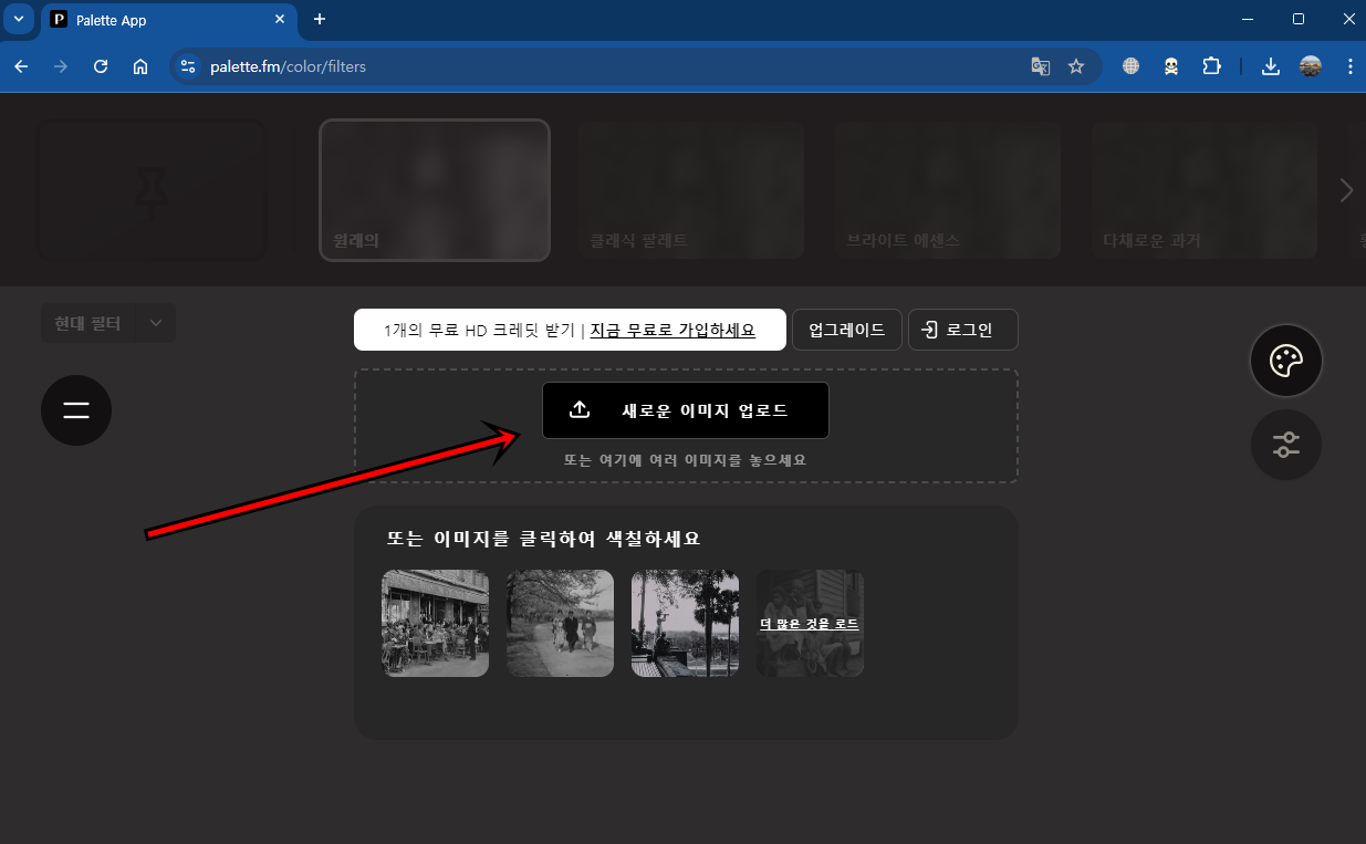 위 사진과 같이 흑백사진 파일을 드래그해서 옮기셔도 되고 "새로운 이미지 업로드"버튼을 클릭하여 사진을 업로드해 주셔도 돼요. 자 그럼 흑백사진 파일을 업로드해 주세요.