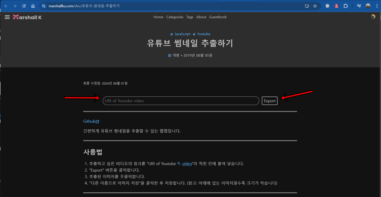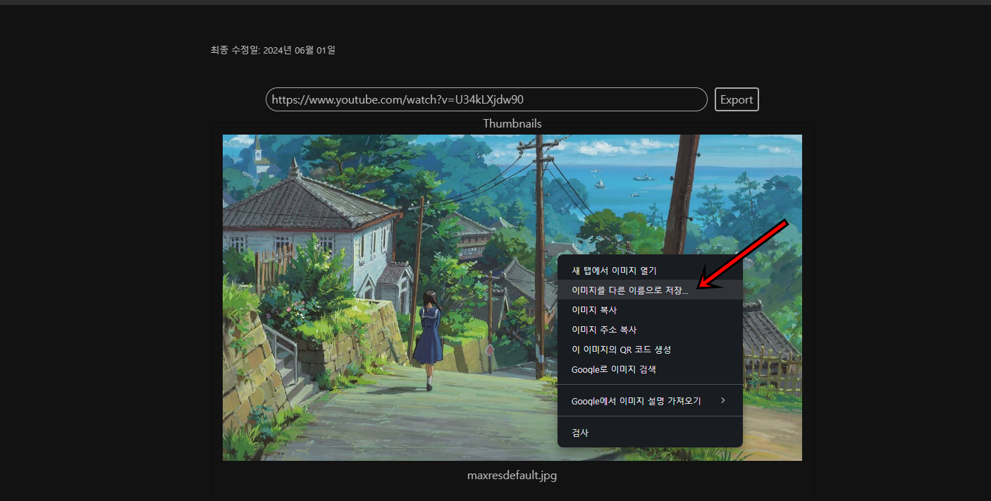이제 위첨부된 링크를 클릭하여 "유튜브 썸네일 추출하기" 웹사이트에 접속 후 그림과 같이 복사한 URL을 붙여 넣기 후 "Export" 버튼을 클릭해 주세요.