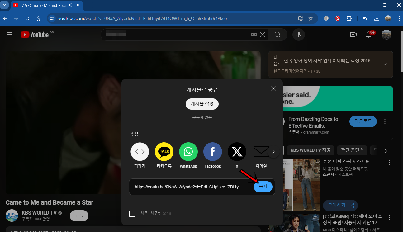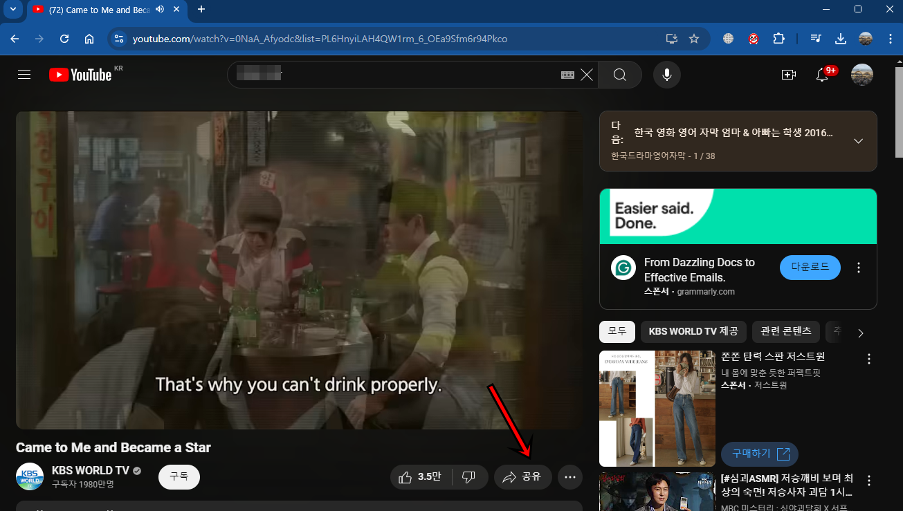 다음은 downsub.com이라는 웹사이트를 이용하여 자막을 텍스트로 다운로드하는 방법이에요. 사진과 같이 "공유"버튼을 클릭해 주세요.