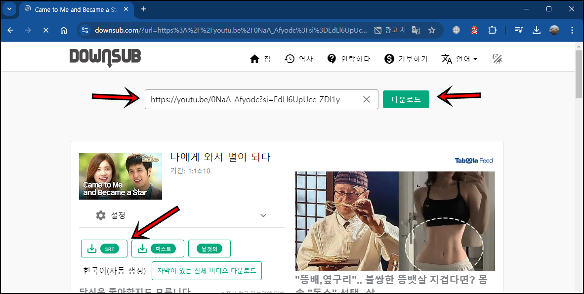 이제 위에 걸어둔 링크를 클릭하여 "downsub.com"사이트로 접속을 해주세요. 복사한 링크를 위 사진 검색창 같은 곳에 붙여 넣기 후 "다운로드"버튼을 클릭해 주시면 왼쪽 하단과 같이 "텍스트"혹은 "SRT"로 다운이 가능해요. 참 쉽죠?