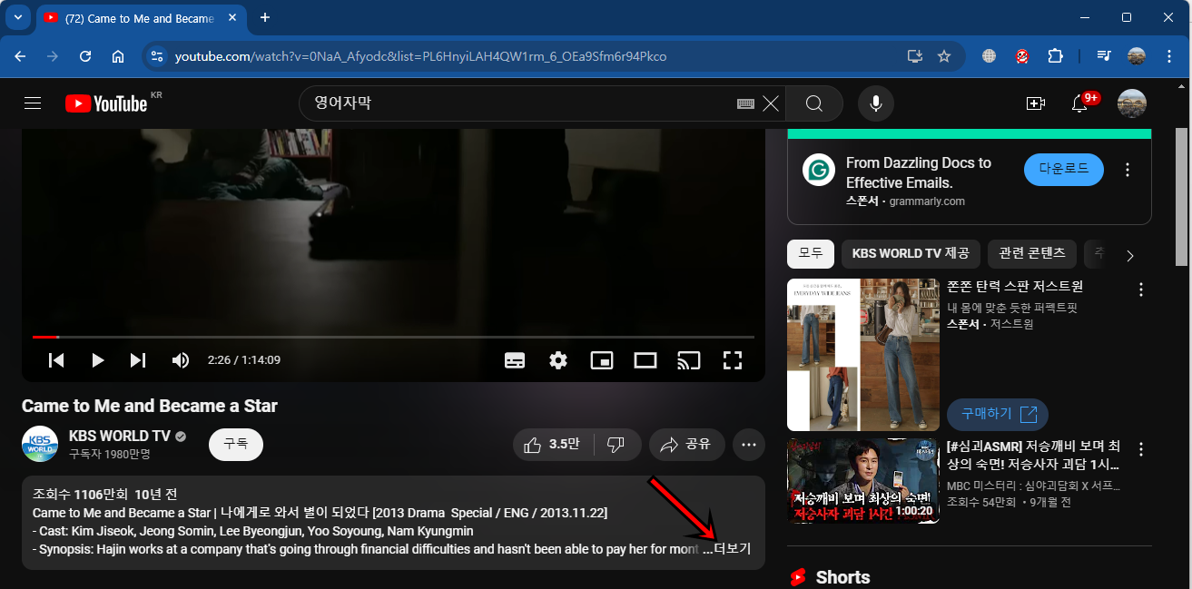 첫 번째는 유튜브 웹사이트에서 자막을 추출하는 방법이에요. 유튜브에서 다운로드하고 싶은 영상의 자막이 있다면 영상을 시청 후 위 사진처럼 "더 보기" 버튼을 클릭해 주세요.