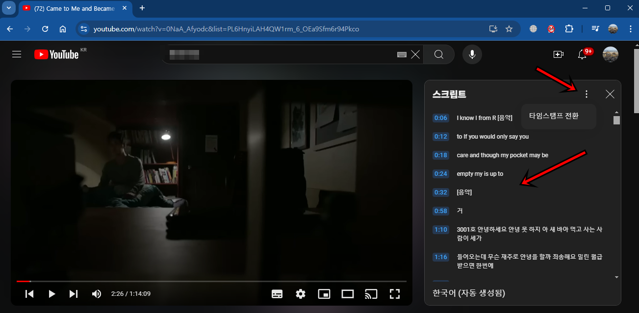 위 사진을 보시면 스크립트 창이 활성화되는데, 여기서 마우스로 드래그해서 컨트롤+C, 컨트롤+V 하여 메모장에 옮기시면 돼요. 만약 타임라인이 거슬린다면 점 모양 아이콘을 클릭후 "타임스탬프 전환"을 클릭하시면 시간 표시가 사라지게 되요. 참 쉽죠?^^
