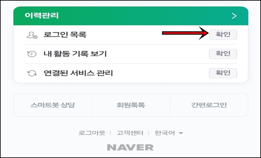 페이지 하단 "이력관리"부분에 "로그인 목록"을 선택해 주세요.